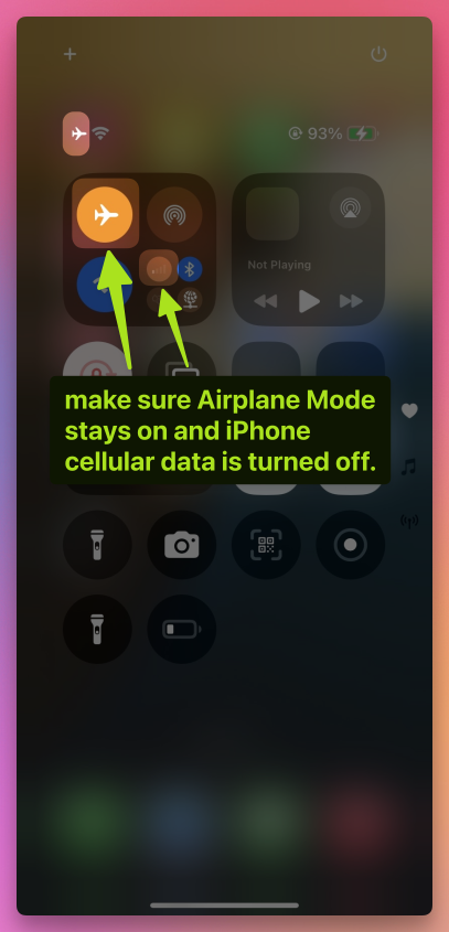 - Make sure Airplane Mode stays on and iPhone cellular data is turned off.
